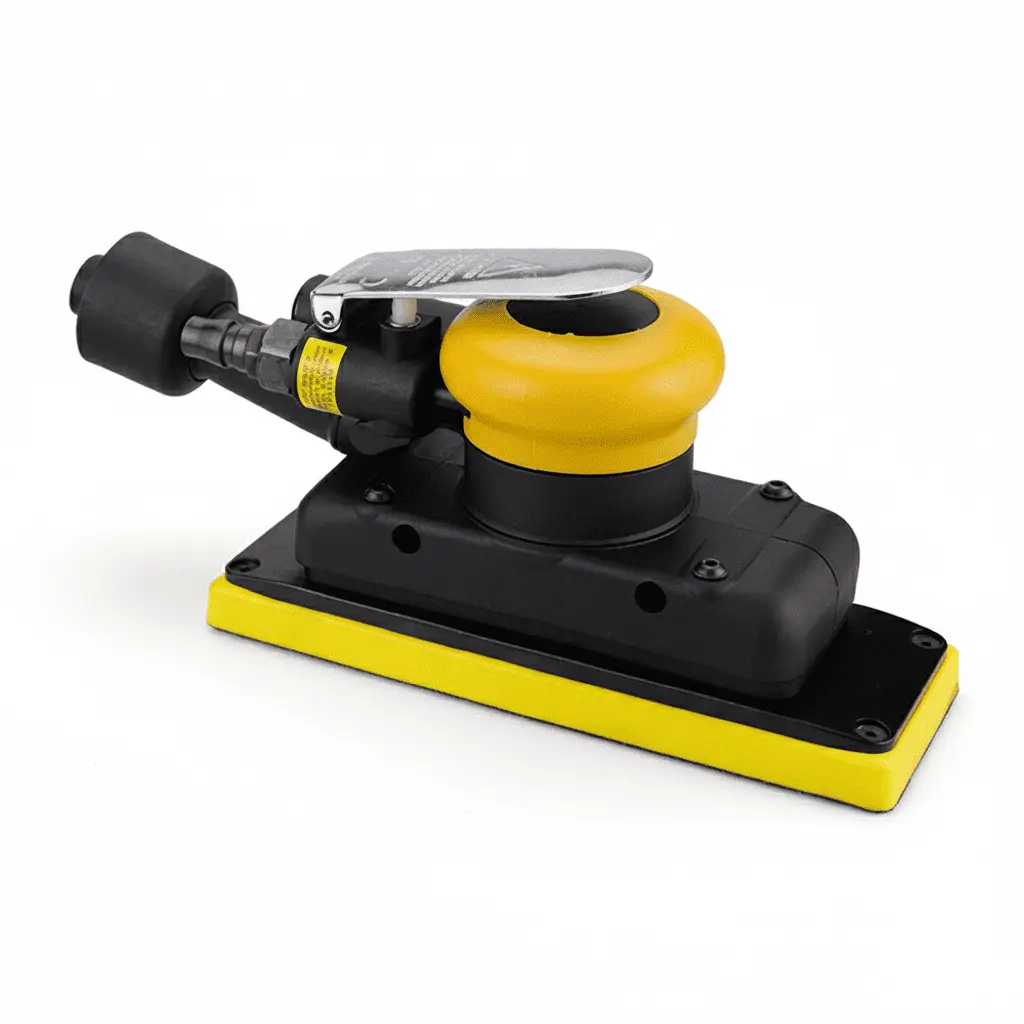 Lijadora neumática profesional de alto rendimiento con cuerpo de composite de alta resistencia y aspiración centralizada. Incluye manguera de aspiración Ø29 mm, regulador de velocidad y entrada de aire con rosca de 1/4”.