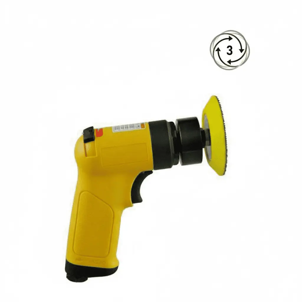 Lijadora neumática compacta con cuerpo de composite de alta resistencia y regulador de velocidad. Equipada con plato Ø75 mm para trabajos de precisión.