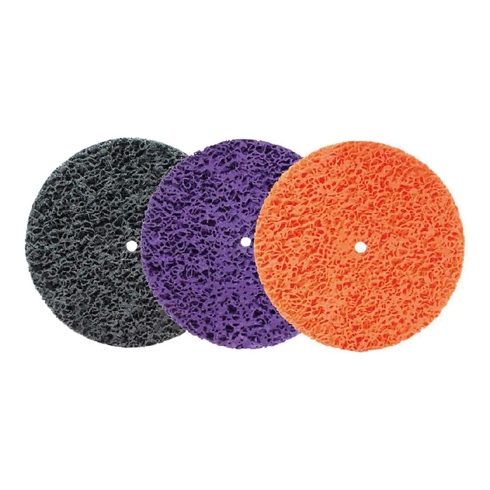 Disco de fibra no tejida y nylon prensado, ideal para limpieza y preparación de superficies. Elimina óxido, pintura y soldadura con acabado uniforme.