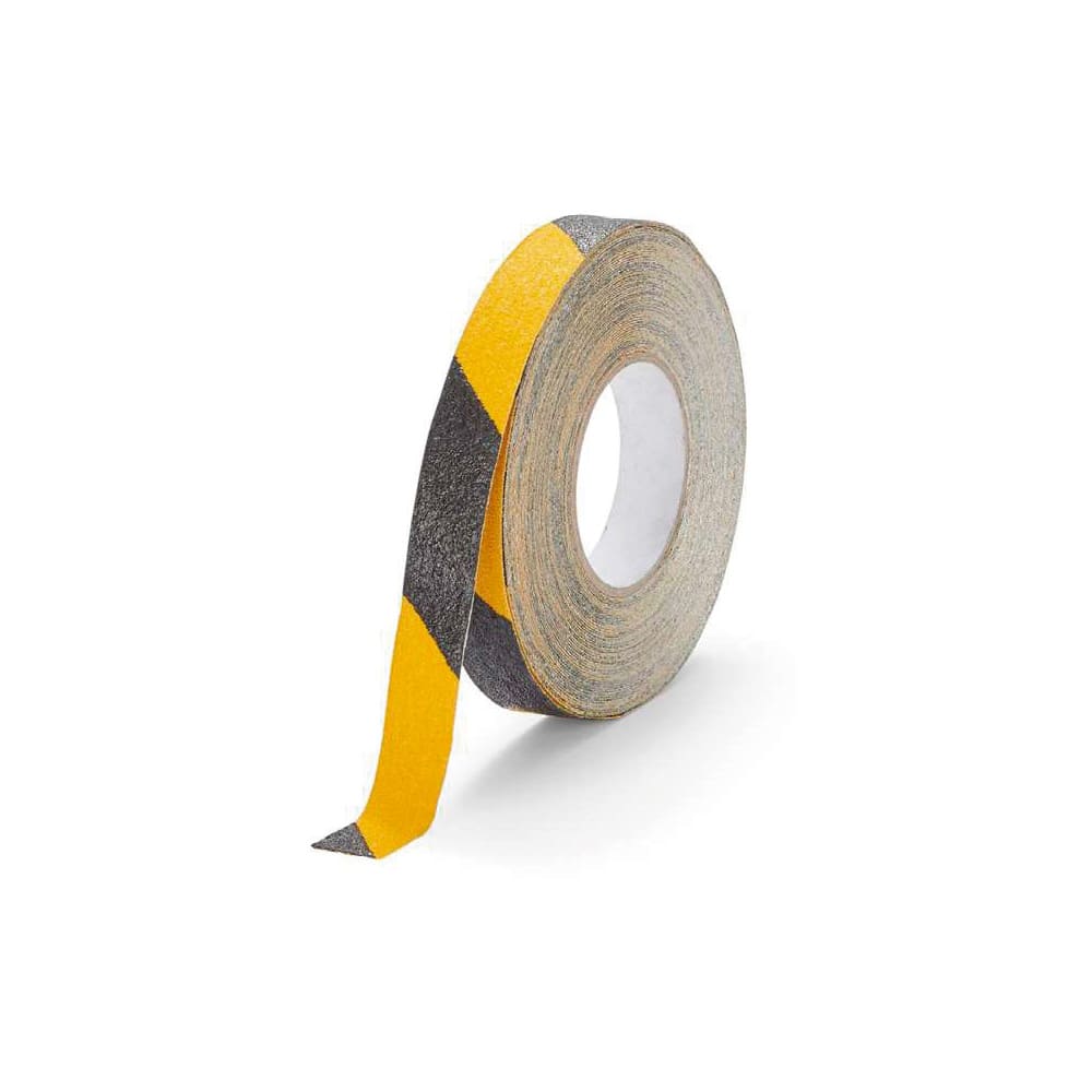 Cinta adhesiva antideslizante amarillo-negra, ideal para zonas de trabajo, escaleras y superficies de tránsito. Alta adherencia y cumplimiento de la normativa europea de seguridad.