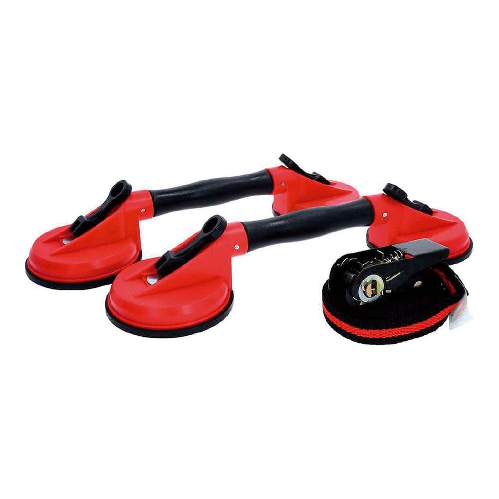 Ventosas dobles de Ø120 mm adaptables a la curvatura de la luna, con cinta de agarre para una sujeción segura. Capacidad de carga de 85 kg.