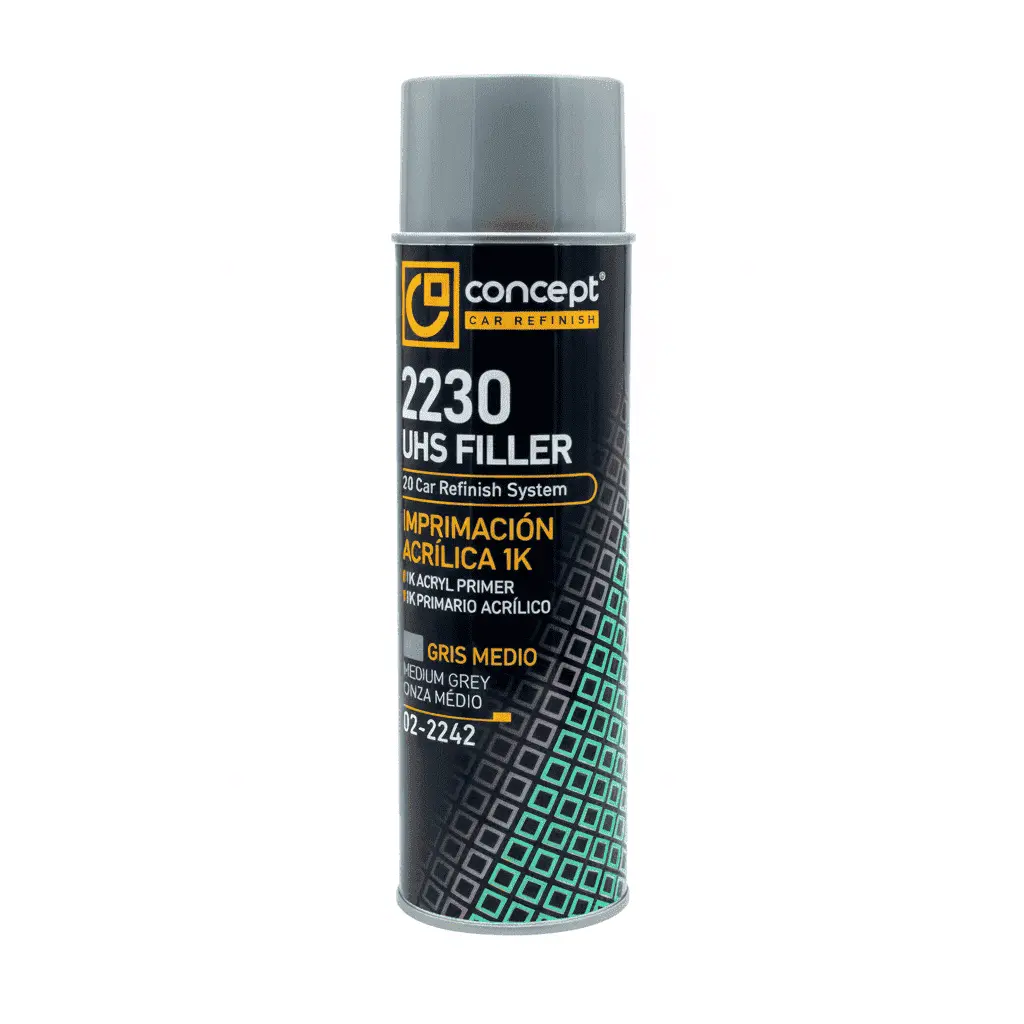 Aparejo acrílico UHS 1K con gran adherencia en metal y plástico. Ofrece alto poder de sellado, propiedades anticorrosivas y secado rápido. Fácil de lijar y repintar. Aerosol 500 ml