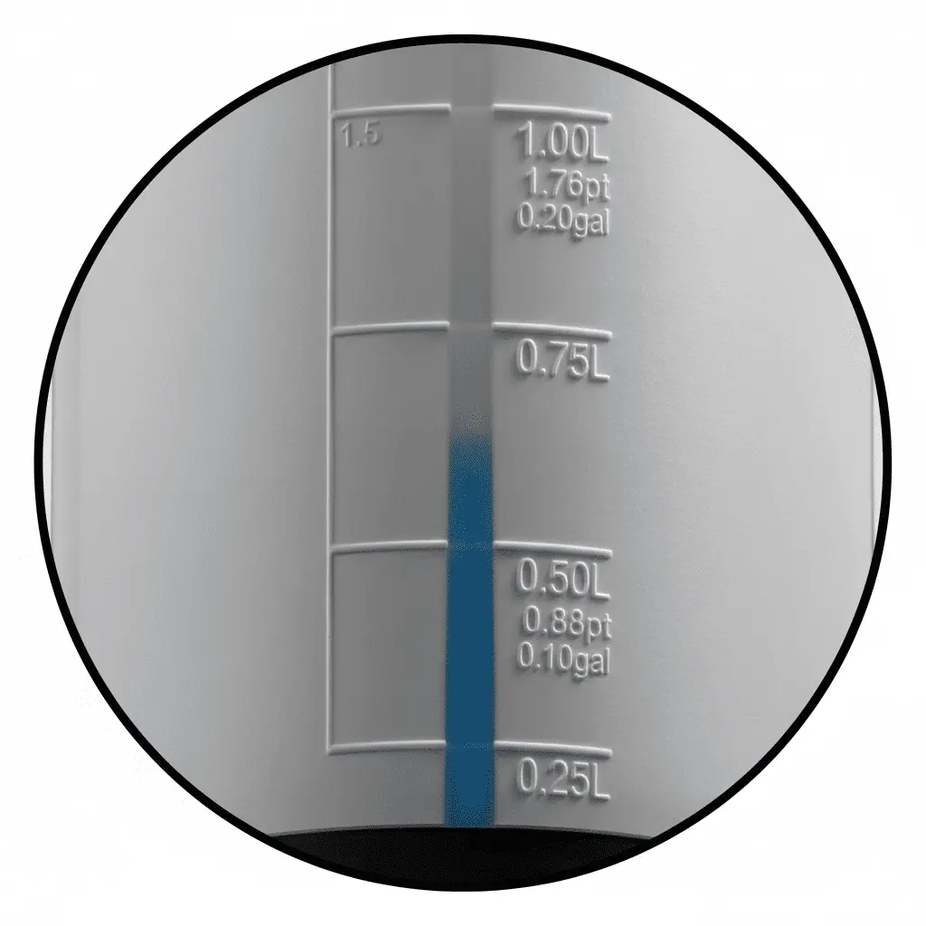 Pulverizador manual a presión de 1,2 L con empuñadura ergonómica, juntas de vitón (FKM/V2) de larga duración e indicador lateral de llenado. Apto para líquidos con base disolvente, petróleo y productos alcalinos. Cuerpo de poliamida (PA), diseñado para uso intensivo en talleres y aplicaciones profesionales.