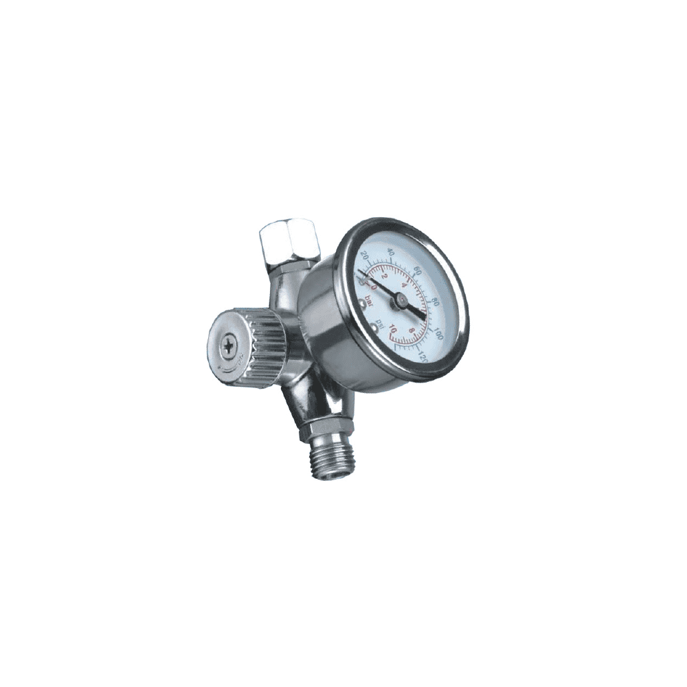 Manómetro regulador para pistolas HVLP y LVMP, fabricado en acero inoxidable con cristal resistente a disolventes. Entrada/salida 1/4”, medición hasta 10 bar / 140 psi. Certificado ISO 9001.
